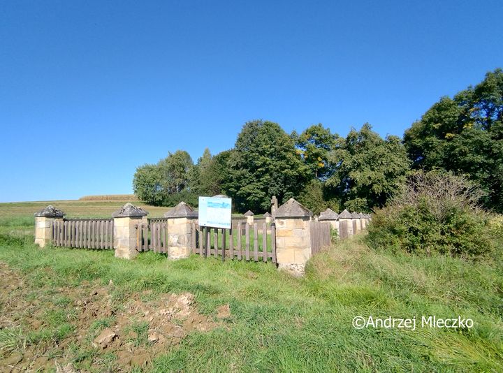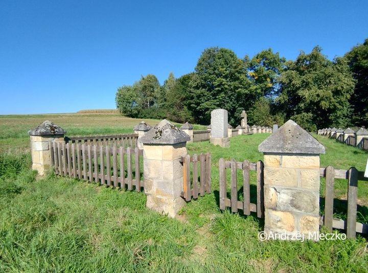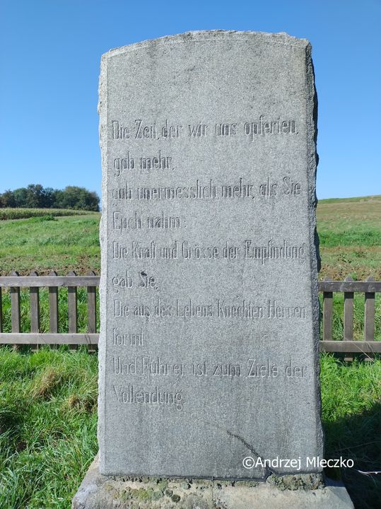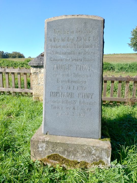 Napis: Treu bis ind den Tod!/ Im Res.Inf. Regt. 217 M.G. Zug fielen hier am 6.12.1914 im Kämpfe für ihr Vaterland und für Befreiung/ Galizens die beiden Brüder/ ADOLF CUNY/ cand. med. (Tübingen)/ Kriegsfreiwilliger/ geb. 21.1.1894/ RICHARD CUNY/ Leutnant im. Inf.Regt. 27 (Halberstadt)/ Führer des M.G. Zuges/ geb. 30.3.1895