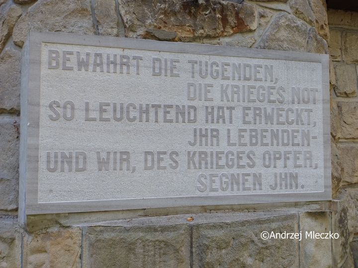 Napis: BEWAHRT DIE TUGENDEN, DIE KRIEGES NOT/ SO LEUCHTEND HAT ERWECKT,/ JHR LEBENDEN –/ UND WIR, DES KRIEGES OPFER,/ SEGNEN JHN.