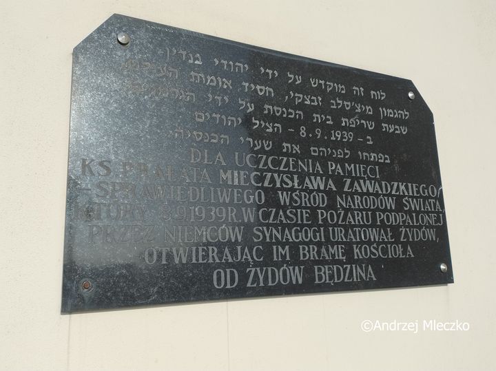 Napis: DLA UCZCZENIA PAMIĘCI/ KS. PRAŁATA MIECZYSŁAWA ZAWADZKIEGO/ - SPRAWIEDLIWEGO WŚRÓD NARODÓW ŚWIATA,/ KTÓRY 8.9.1939 R. W CZASIE POŻARU PODPALONEJ/ PRZEZ NIEMCÓW SYNAGOGI URATOWAŁ ŻYDÓW,/ OTWIERAJĄC IM BRAMĘ KOŚCIOŁA/ OD ŻYDÓW BĘDZINA