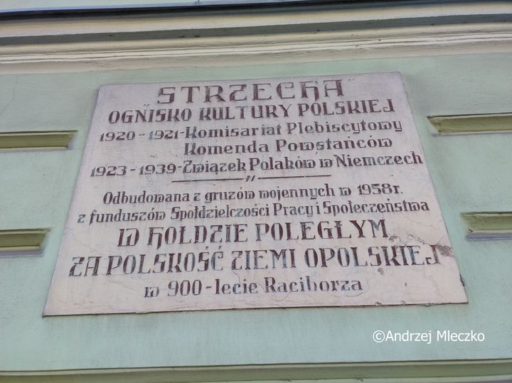 Napis: STRZECHA/ OGNISKO KULTURY POLSKIEJ/ 1920 – 1921 – Komisariat Plebiscytowy/ Komenda Powstańców/ 1923 – 1939 – Związek Polaków w Niemczech/ Odbudowana z gruzów wojennych w 1958r./ W HOŁDZIE POLEGŁYM/ ZA POLSKOŚĆ ZIEMI OPOLSKIEJ/ w 900 – lecie Raciborza