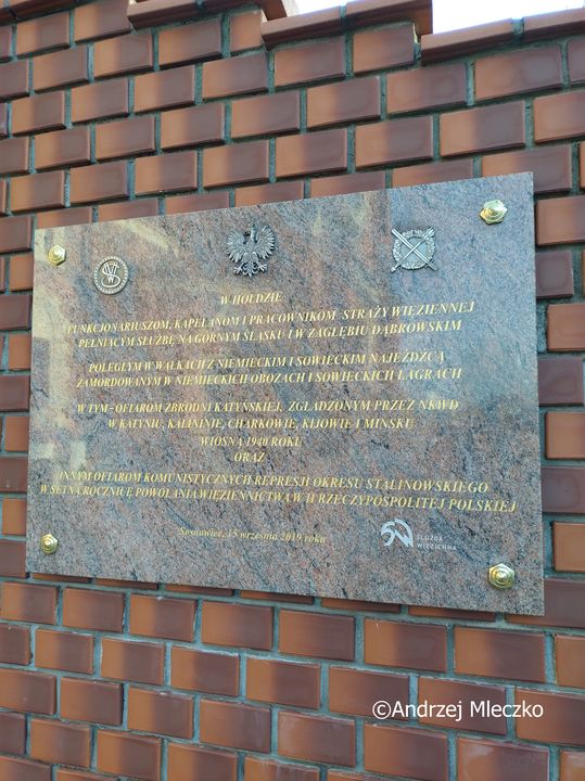 Napis: W HOŁDZIE/ FUNKCJONARIUSZOM, KAPELANOM I PRACOWNIKOM STRAŻY WIĘZIENNEJ/ PEŁNIĄCYM SŁUŻBĘ NA GÓRNYM ŚLĄSKU I W ZAGŁĘBIU DĄBROWSKIM/ POLEGŁYM W WALKACH Z NIEMIECKIM I SOWIECKIM NAJEŹDŹCĄ/ ZAMORDOWANYM W NIEMIECKICH OBOZACH I SOWIECKICH ŁAGRACH/ W TYM – OFIAROM ZBRODNI KATYŃSKIEJ, ZGŁADZONYM PRZEZ NKWD/ W KATYNIU, KALININIE, CHARKOWIE, KIJOWIE I MIŃSKU/ WIOSNĄ 1940 ROKU/ ORAZ/ INNYM OFIAROM KOMUNISTYCZNYCH REPRESJI OKRESU STALINOWSKIEGO/ W SETNĄ ROCZNICĘ POWOŁANIA WIĘZIENNICTWA W II RZECZYPOSPOLITEJ POLSKIEJ/ Sosnowiec, 15 września 2019 roku