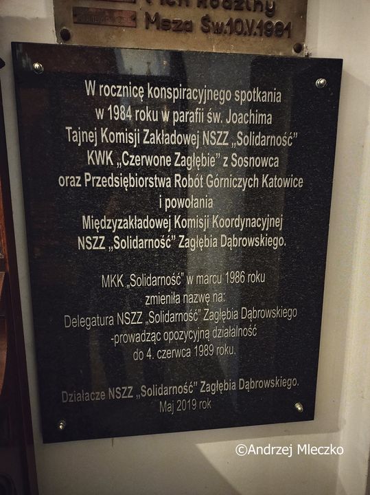 Napis: W rocznicę konspiracyjnego spotkania/ w 1984 roku w parafii św. Joachima/ Tajnej Komisji Zakładowej NSZZ „Solidarność”/ KWK „Czerwone Zagłębie” z Sosnowca/ oraz Przedsiębiorstwa Robót Górniczych Katowice/ i powołania/ Międzyzakładowej Komisji Koordynacyjnej/ NSZZ „Solidarność” Zagłębia Dąbrowskiego/ MKK „Solidarność” w marcu 1986 roku/ zmieniła nazwę na:/ Delegatura NSZZ „Solidarność” Zagłębia Dąbrowskiego/ -prowadząc opozycyjną działalność/ do 4. czerwca 1989 roku./ Działacze NSZZ „Solidarność” Zagłębia Dąbrowskiego./ Maj 2019 rok