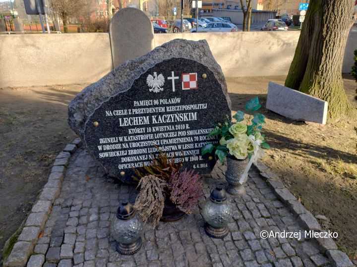 Napis: PAMIĘCI 96 POLAKÓW/ NA CZELE Z PREZYDENTEM RZECZYPOSPOLITEJ/ LECHEM KACZYŃSKIM/ KTÓRZY 10 KWIETNIA 2010 R./ ZGINĘLI W KATASTROFIE LOTNICZEJ POD SMOLEŃSKIEM/ W DRODZE NA UROCZYSTOŚCI UPAMIĘTNIENIA 70 ROCZNICY/ SOWIECKIEJ ZBRODNI LUDOBÓJSTWA W LESIE KATYŃSKIM/ DOKONANEJ NA JEŃCACH WOJENNYCH/ OFICERACH WOJSKA POLSKIEGO W 1940 R./ 6.4.2014