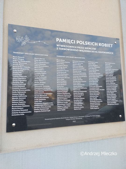 Napis: PAMIĘCI POLSKICH KOBIET/ WYWIEZIONYCH PRZEZ NIEMCÓW/ Z TARNOWSKIEGO WIĘZIENIA DO KL RAVENSBRÜCK/ TRANSPORT SPECJALNY WRZESIEŃ 1940/ Maria Banach/ Maria Biegoń/ Jadwiga Bieńkowska/ Aniela Błaszczak/ Józefa Bylok/ Maria Didur-Załuska/ Maria Drohojewska/ Zofia Dudek/ Aniela Dul/ Irena Elgas/ Helena Filipczuk/ Alina Filipowicz/ Maria Filipowicz/ Matylda Flak/ Aniela Franczyk/ Irena Gawdzik/ Elżbieta Gemser/ Janina Gruszczyńska/ Zofia Gutowska/ Helena Hujsak/ Aniela Jabłońska/ Wanda Jannasz/ Józefa Kalisz/ Helena Kapusta/ Aniela Kawalec/ Bronisława Kolińska/ Maria Kołacz/ Antonina Kozubek/ Jolanta Krzyżanowska/ Antonina Kula/ Maria Liberak/ Zofia Marusarz/ Maria Moldenhawer/ Maria Molenda/ Julia Nowakiewicz/ Maria Penar/ Maria Piękoś/ Adela Pilarczyk/ Ludwika Pinkos/ Aniela Radyk/ Łucja Rolleczek/ Jadwiga Seifert/ Irena Sitarz/ Renėe Skalska/ Adela Sroka/ Genowefa Szczerba/ Stanisława Szewczyk/ Stanisława Szpakowska/ Anna Sztark/ Stanisława Tyszkiewicz/ Teresa Wantuch/ Maria Wierzbińska/ Zofia Zielińska/ Julia Zięć/ Kazimiera Znamirowska/ Aleksandra Żelechowska/ Barbara Żelechowska/ Emilia Żołnierczyk/ Eugenia Żołnierczyk/ TRANSPORT SPECJALNY WRZESIEŃ 1941/ Maria Alszer/ Wincentyna Balicka/ Irena Bany/ Kazimiera Baran/ Jadwiga Bartel/ Maria Bartel/ Stanisława Bartel/ Zofia Bartosik/ Maria Batkiewicz/ Emilia Berestko/ Stanisława Biernat/ Maria Bigo/ Maria Bogdan/ Maria Brandys/ Irena Brilland/ Maria Buś/ Władysława Buś/ Maria Bytomska/ Elżbieta Chajec/ Helena Chełmecka/ Kazimiera Chrobak/ Józefa Czaban/ Antonina Czermak/ Stefania Czuba/ Bronisława Ćwiklik/ Tacjana Filipowicz/ Felicja Fulińska/ Anna Gabiś/ Antonina Gąsienica/ Wanda Gątarska/ Józefa Gibek/ Wiktoria Gliniak/ Antonina Golonka/ Hanna Gryzina-Lasek/ Wanda Grzyb/ Anna Hertmanowska/ Stanisława Horowska/ Jadwiga Iwaszkiewicz/ Zofia Janczy/ Janina Jarolim/ Władysława Jasnosz/ Anna Jęglet/ Julia Kałuźniacka/ Józefa Kantor/ Alicja Kasprzykiewicz/ Maria Kato/ Wiktoria Kisielewska/ Aniela Konopka/ Wanda Kozdruń/ Janina Król/ Hermina Kuhnen/ Karolina Kurc/ Maria Koruc/ Jadwiga Kuta/ Ewa Lasocka/ Stefania Lipska/ Maria Liwo/ Kazimiera Lukas/ Anna Madej/ Helena Magiera/ Krystyna Majewska/ Zofia Majoch/ Franciszka Makuc/ Janina Malik/ Stefania Małochleb/ Stanisława Marchwicka/ Józefa Marszałek/ Janina Marzec/ Krystyna Marzec/ Irena Matusiak/ Anna Mester/ Irma Misiewicz/ Franciszka Morawska/ Stanisława Mróz/ Stanisława Mróz-Prudnik/ Zenona Nowak/ Maria Ostrowska/ Janina Oszurko/ Antonina Para/ Zyta Pawlik/ Zofia Pawlikiewicz/ Kazimiera Pomorska/ Danuta Potoniec/ Izabela Potoniec/ Józefa Repel/ Zofia Rogacka/ Maria Rydarowska/ Zofia Ryś/ Stefania Sak/ Janina Sas/ Stanisława Schönemann/ Maria Skrzypek/ Anna Sowiźrał/ Regina Spitter/ Anna Spólnik/ Genowefa Spólnik/ Janina Stefaniszyn/ Józefa Stefaniszyn/ Maria Stycuła/ Zorita Sukiennik/ Stanisława Szczeklik/ Kazimiera Szczygieł/ Paulina Szumełda/ Kazimiera Weigel/ Zofia Wesołowska/ Aniela Wideł/ Rozalia Witasek/ Maria Witkowska/ Jadwiga Wójcik/ Waleria Wypiór/ Helena Zachemska/ Maria Zawidzka/ Władysława Ziomek/ Stowarzyszenie Rodzina Ravensbrück Zakład Karny w Tarnowie Fundacja Pro Patria Semper/ Instytut Pamięci Narodowej/ 2023