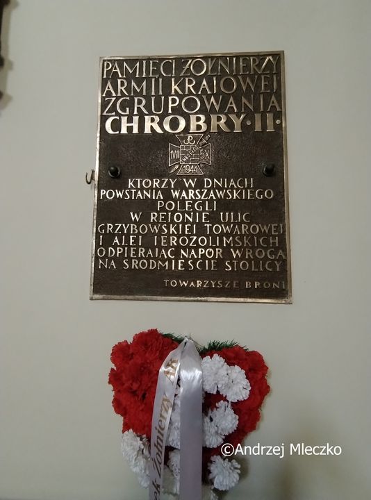 Napis: PAMIĘCI ŻOŁNIERZY/ ARMII KRAJOWEJ/ ZGRUPOWANIA/ CHROBRY II/ KTÓRZY W DNIACH/ POWSTANIA WARSZAWSKIEGO/ POLEGLI/ W REJONIE ULIC/ GRZYBOWSKIEJ TOWAROWEJ/ I ALEI JEROZOLIMSKICH/ ODPIERAJĄC NAPÓR WROGA/ NA ŚRÓDMIEŚCIE STOLICY/ TOWARZYSZE BRONI