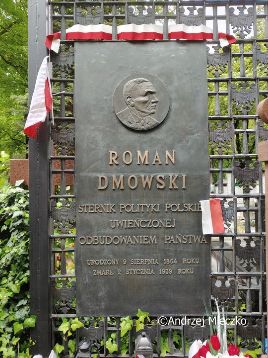 Napis: ROMAN/ DMOWSKI/ STERNIK POLITYKI POLSKIEJ/ UWIEŃCZONEJ/ ODBUDOWANIEM PAŃSTWA/ URODZONY 9 SIERPNIA 1864 ROKU/ ZMARŁ 2 STYCZNIA 1939 ROKU