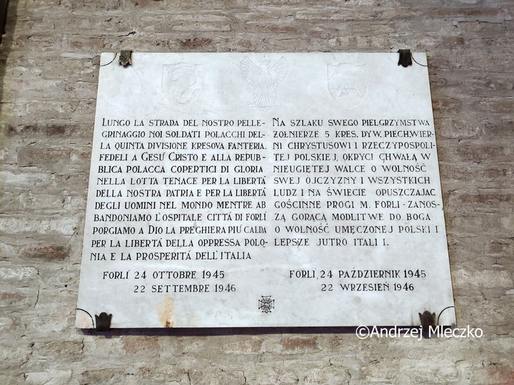 LUNGO LA STRADA DEL NOSTRO PELLE-/ GRINAGGIO NOI SOLDATI POLACCHI DEL-/ LA QUINTA DIVISIONE KRESOVA FANTERIA./ FEDELI A GESU CRISTO E ALLA REPUB-/ BLICA POLACCA COPERTICI DI GLORIA/ NELLA LOTTA TENACE PER LA LIBERTA / DELLA NOSTRA PATRIA E PAR LA LIBERTA/ DEGLI UOMINI NEL MONDO MENTRE AB/ BANDONIAMO L`OSPITALE CITTA DI FORLI/ PORGIAMO A DIO LA PREGHIERA PIU CALDA/ PER LA LIBERTA DELLA OPRESSA POLO-/ NIA E LA PROSPERITA DELL`ITALIA/ FORLI 24 OTTOBRE 1945/ 22 SETTEMBRE 1946